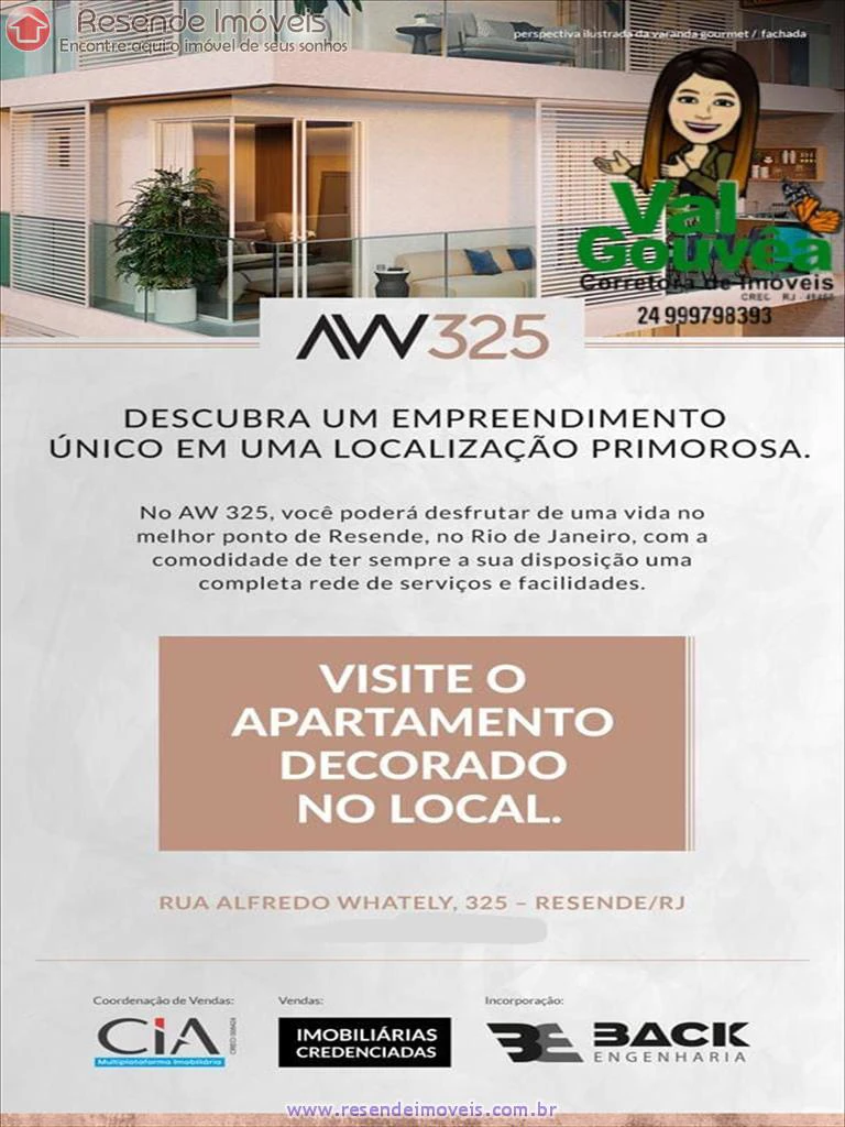 Venha conhecer o mais novo empreendimento em Campos Elíseos na cidade de Resende/RJ. Conheça o AW325 - DUO. Tenho certeza que vai se apaixonar! Excelente localização, lazer completo. 02 torres, sendo 01 pronta em dez/24 e outra será entregue em dez/25. Temos apartamentos de 78m² a 125m² de 2, 3 quartos e coberturas de até 250m². Tudo isso com desconto para pagamento à vista e planos de financiamento próprios imperdíveis. Agende sua visita (24)99979-8393. Aceitamos seu imóvel como entrada, sujeito à avaliação.