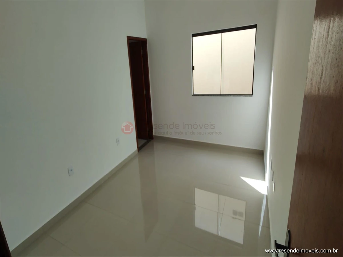 Casa nova com três quartos sendo uma suíte, sala, jardim de inverno, cozinha com armário abaixo da pia, banheiro social, área de serviço e quintal com grama.